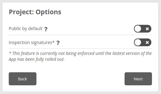 To improve public access for users without an account for to Inspect7 you can now configure projects to automatically enable public access for each new assignment. To enable this feature simply check the `Public by default` option when creating a new project or for an existing project head to Projects -> Project -> Edit -> Options and check the “Public by default” option.
